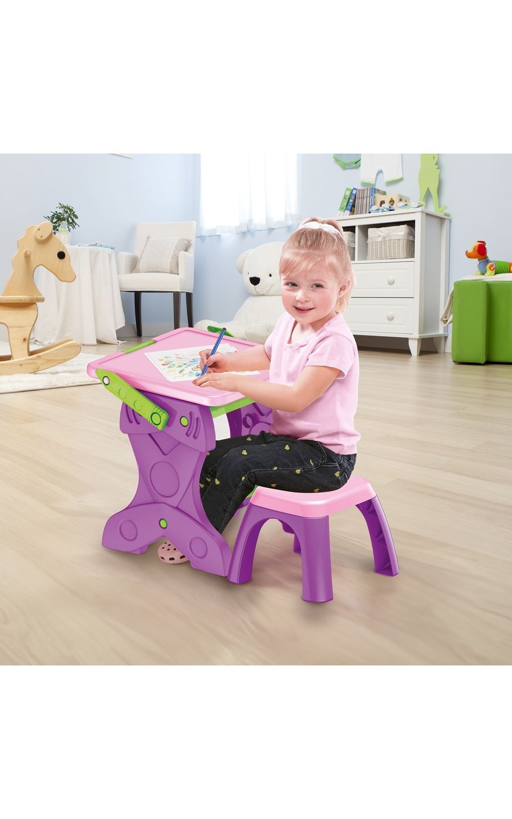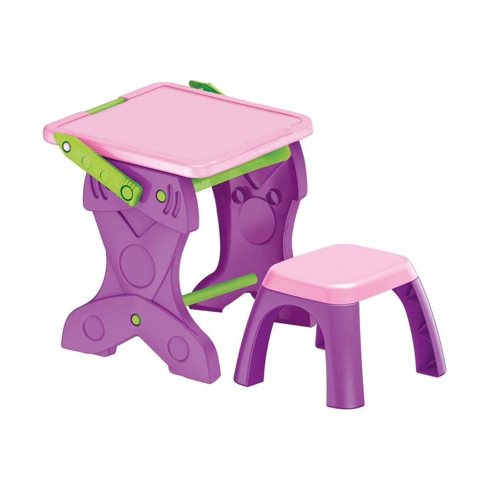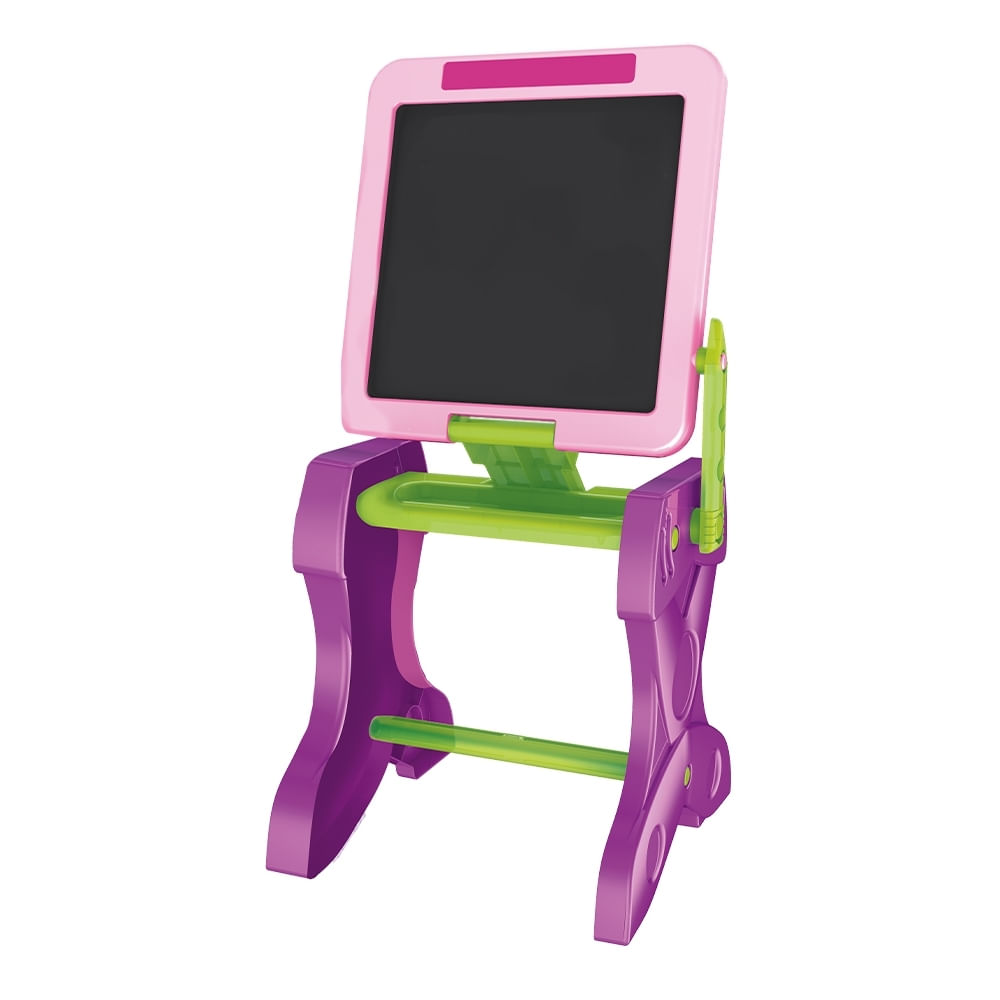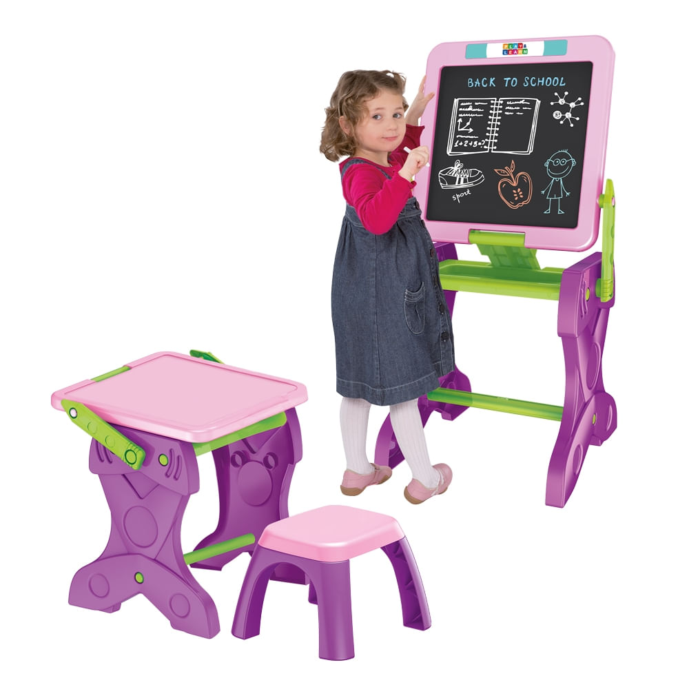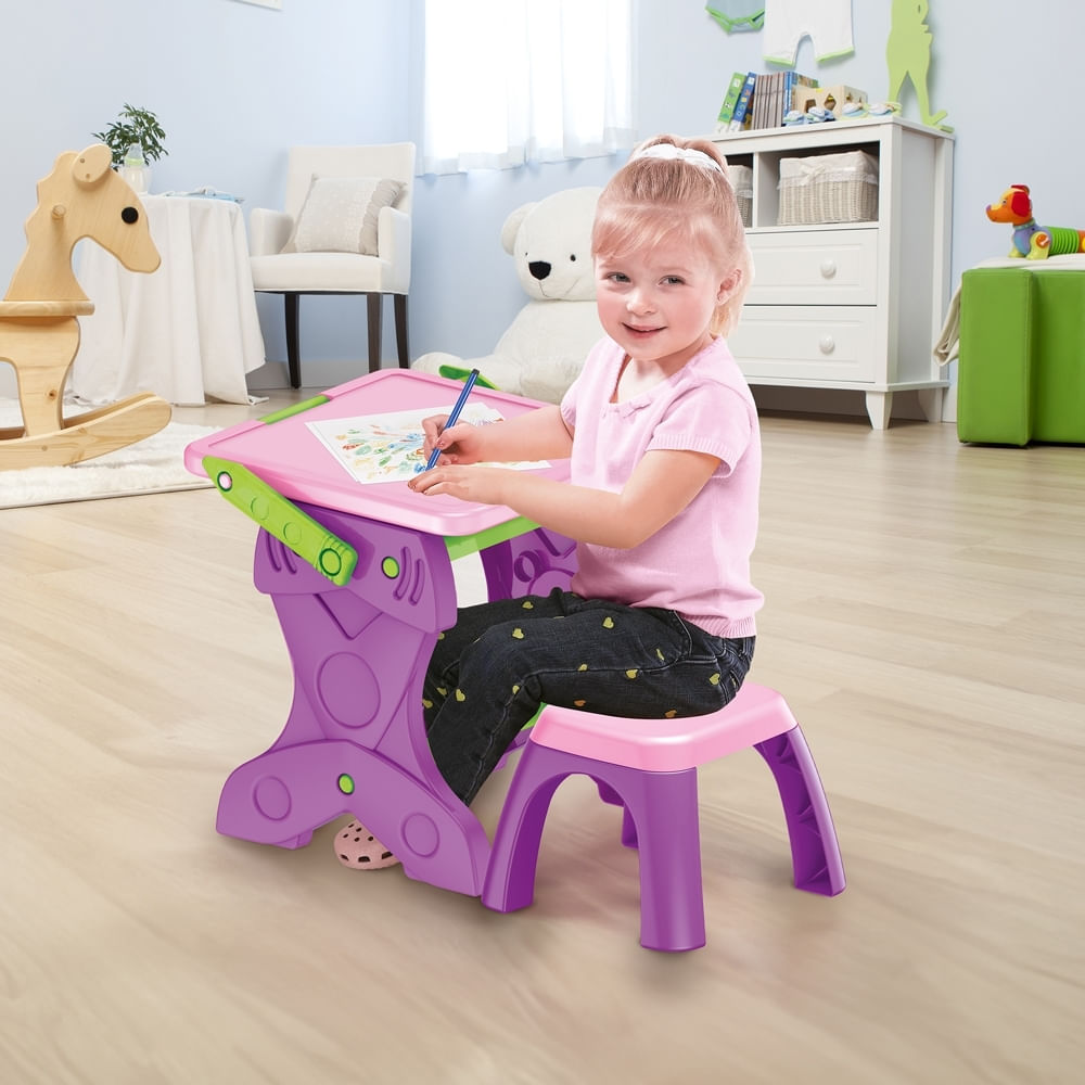 Além disso, o produto vem com 12 giz de cera, um apagador e 12 folhas de papel, oferecendo todas as ferramentas necessárias para atividades artísticas e educativas. O design com banquinho confortável torna a experiência ainda mais completa, proporcionando a altura ideal para as crianças realizarem suas tarefas com segurança e comodidade.