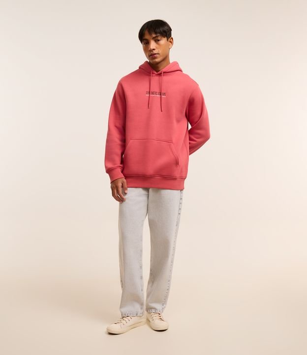 Casaco masculino fechado confeccionado em algodão mais sustentável, no modelo comfort. Possui capuz, com cordão ajustável, manga longa, bolso canguru, barras ajustadas e estampa lettering, frente e costas "Synthetic escape".
