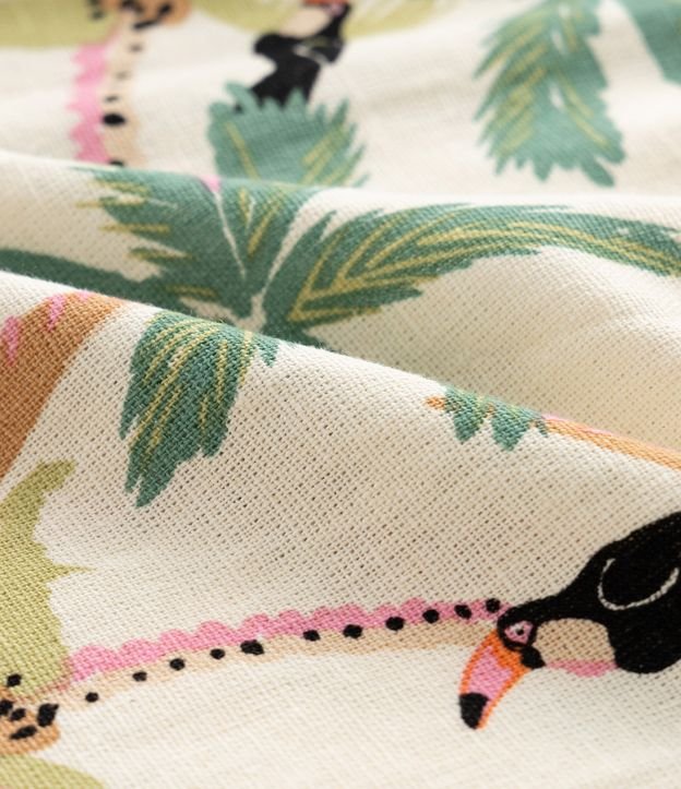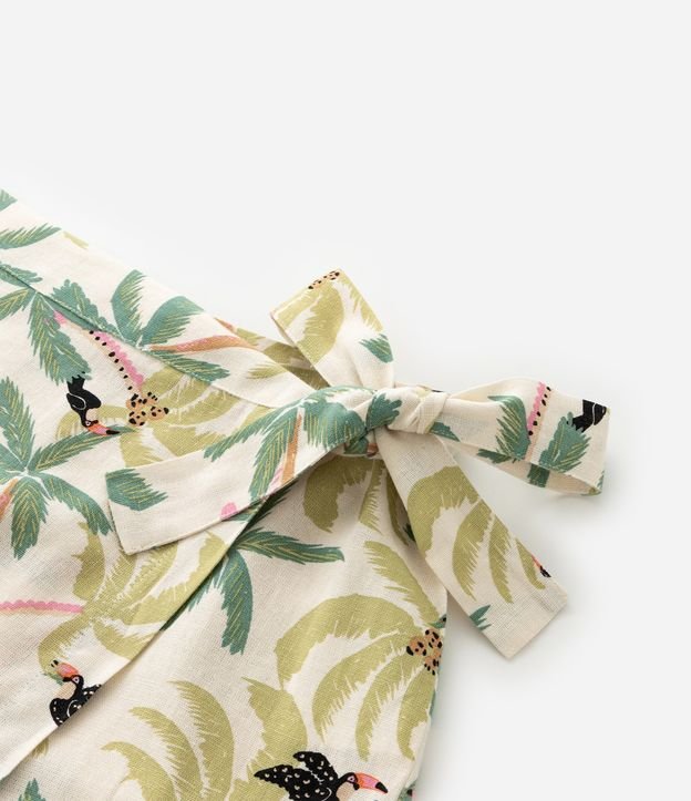 Short saia com transpasse frontal e amarração lateral. A peça tem linda estampa tropical de tucanos e coqueiros.