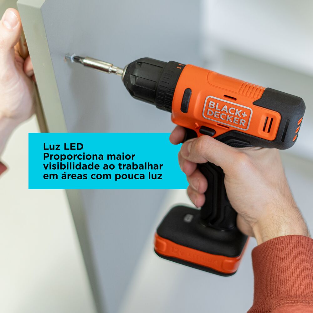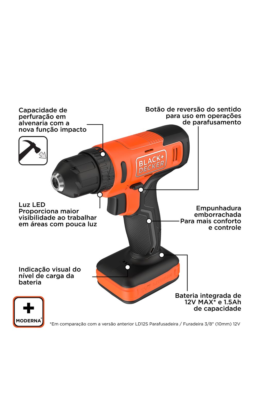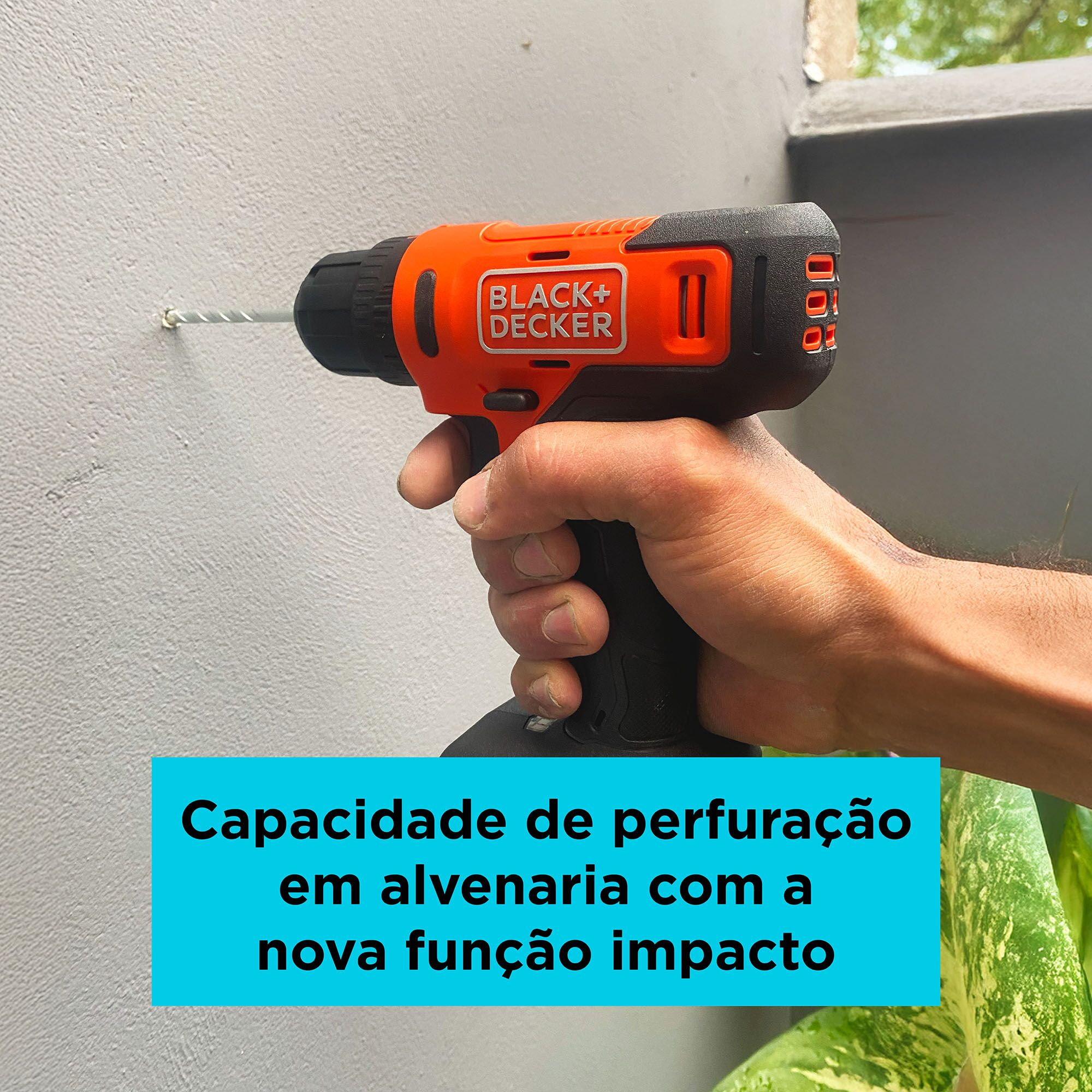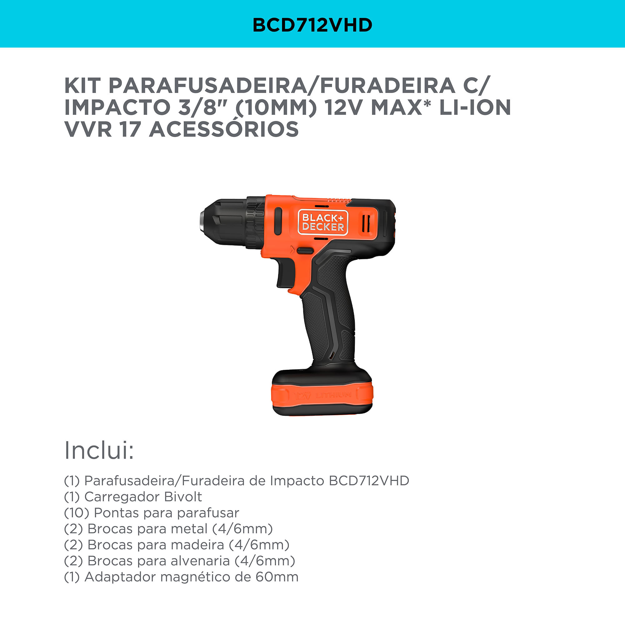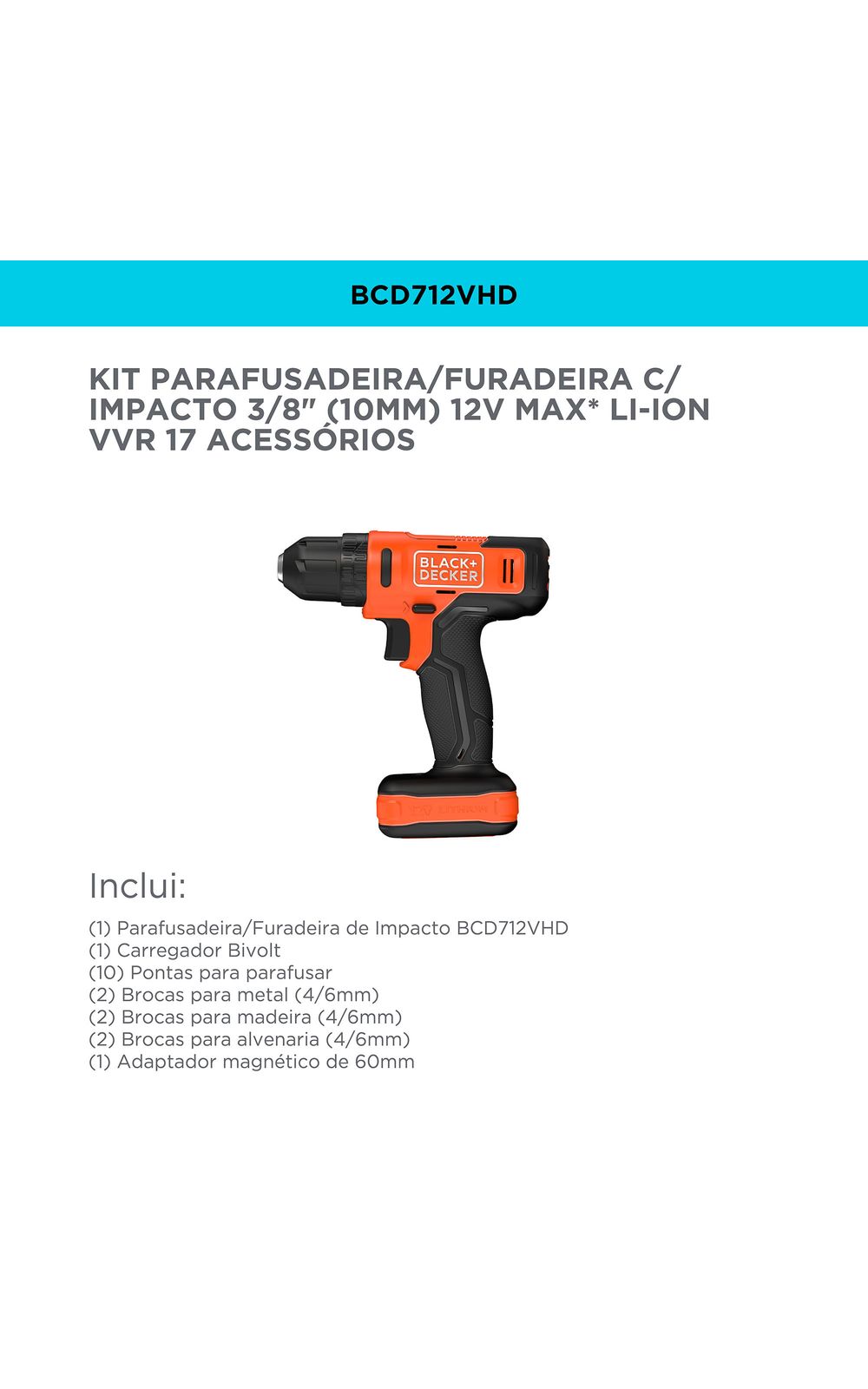 Descubra a versatilidade e potência do Kit Parafusadeira / Furadeira de Impacto BLACK DECKER 12V MAX* LI-ION, uma solução completa para suas tarefas de fixação e perfuração com 17 acessórios e carregador bivolt