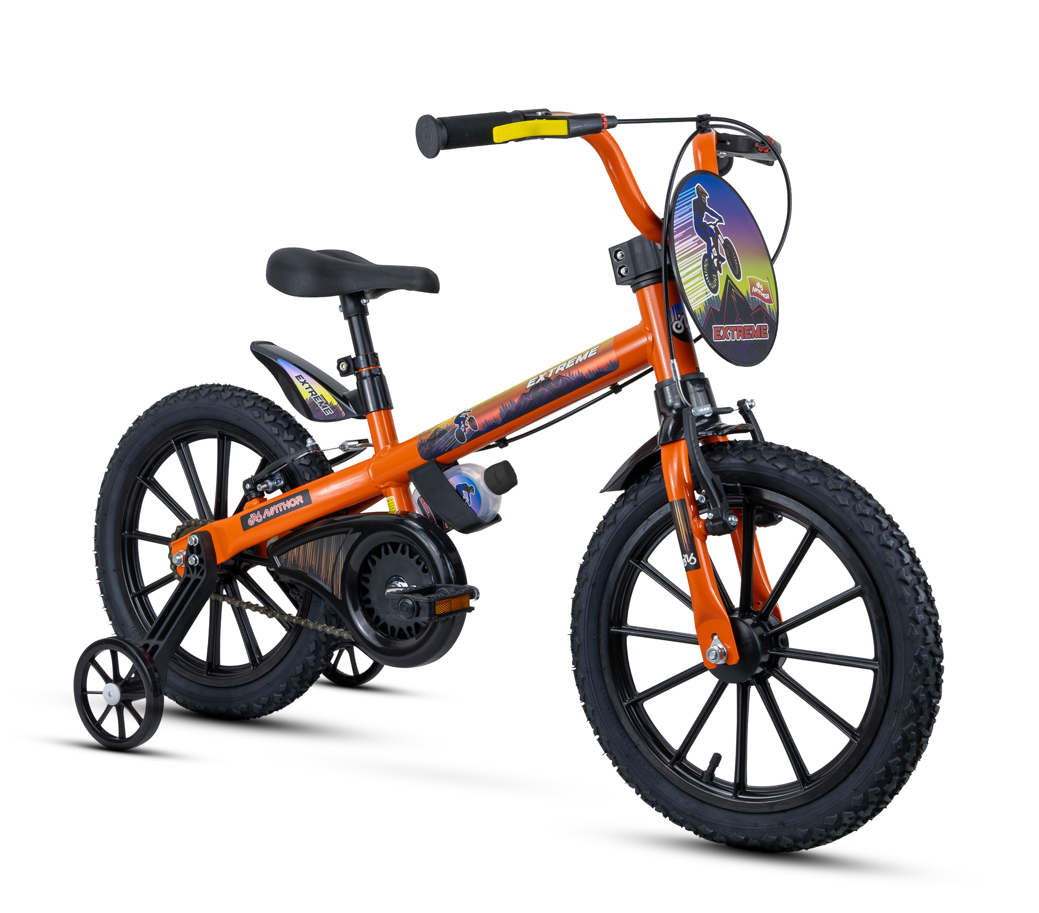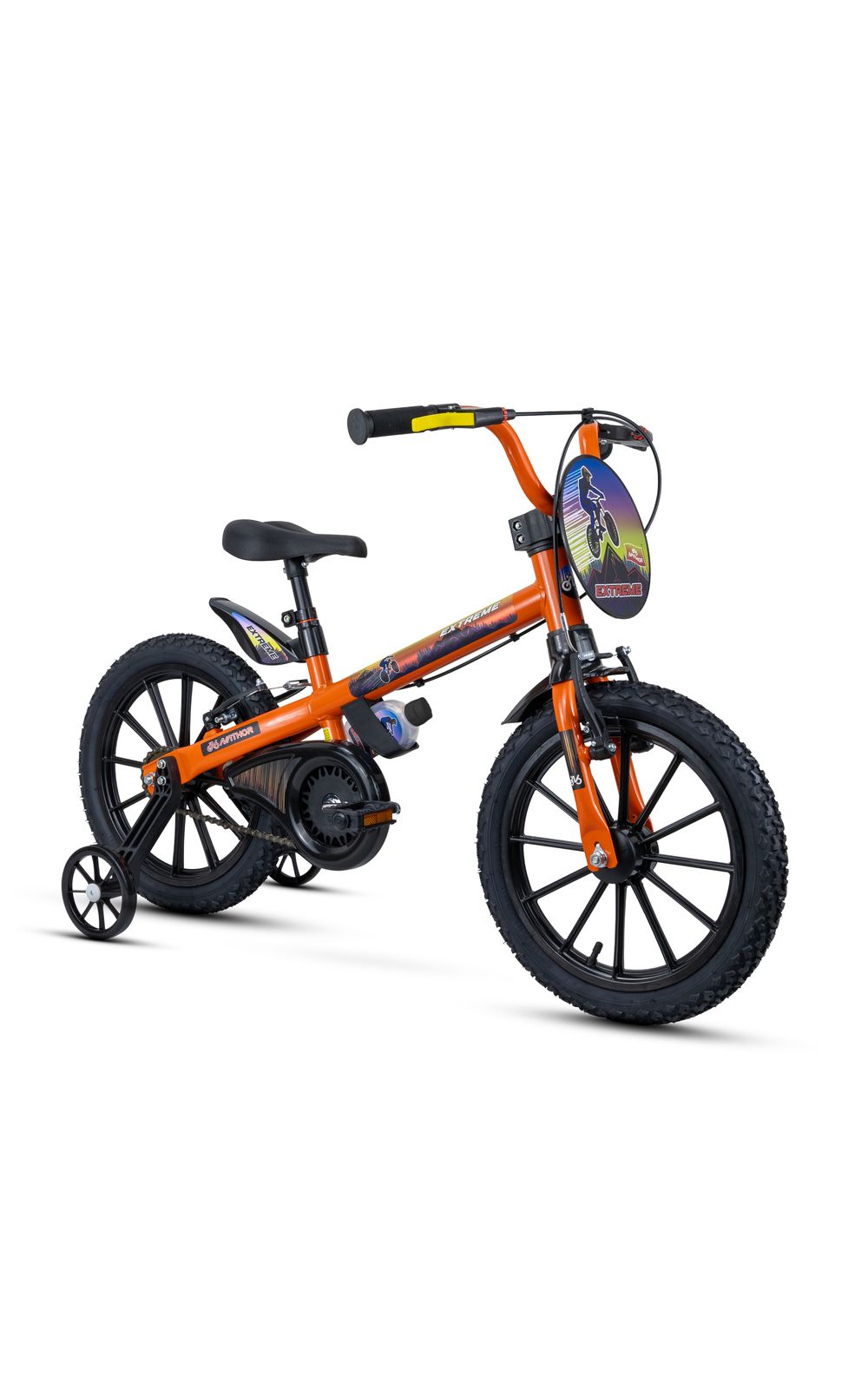 A Bicicleta Infantil NATHOR EXTREME Aro 16 é desenvolvida para crianças a partir de 5 anos, com altura entre 1,10 m e 1,20 m, suportando até 30 kg. Sua estrutura em