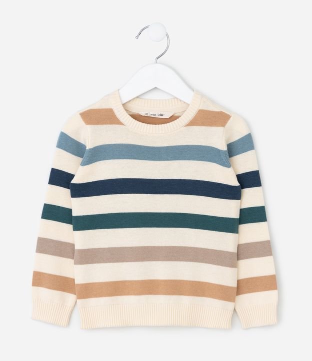 Casaco infantil em tricô leve confeccionado em algodão certificado BCI e boas práticas ambientais. Possui gola redonda, mangas longas e listras largas distribuídas por toda a peça. Acabamentos canelados garantem melhor estrutura, mantendo toque macio e caimento confortável.