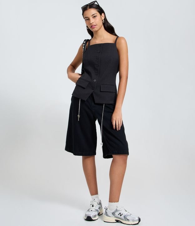 Colete feminino confeccionado em alfaiataria, com alcinhas finas e fechamento frontal por botões. Possui modelagem alongada e bolsos decorativos, trazendo sofisticação e modernidade ao visual. Confeccionado com boas práticas ambientais e viscose certificada para um estilo consciente.