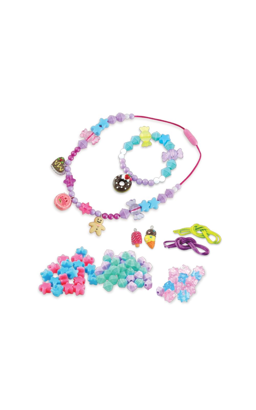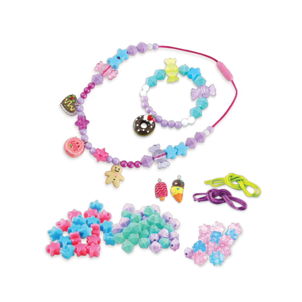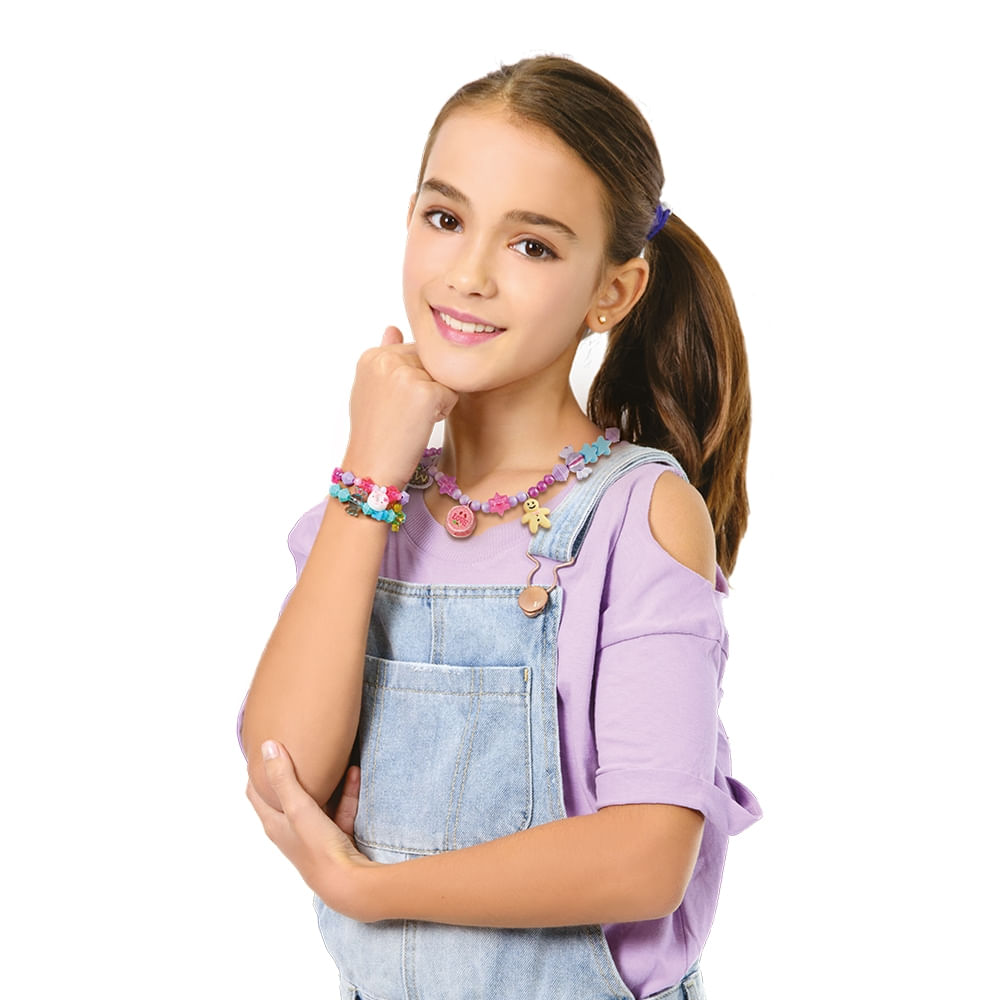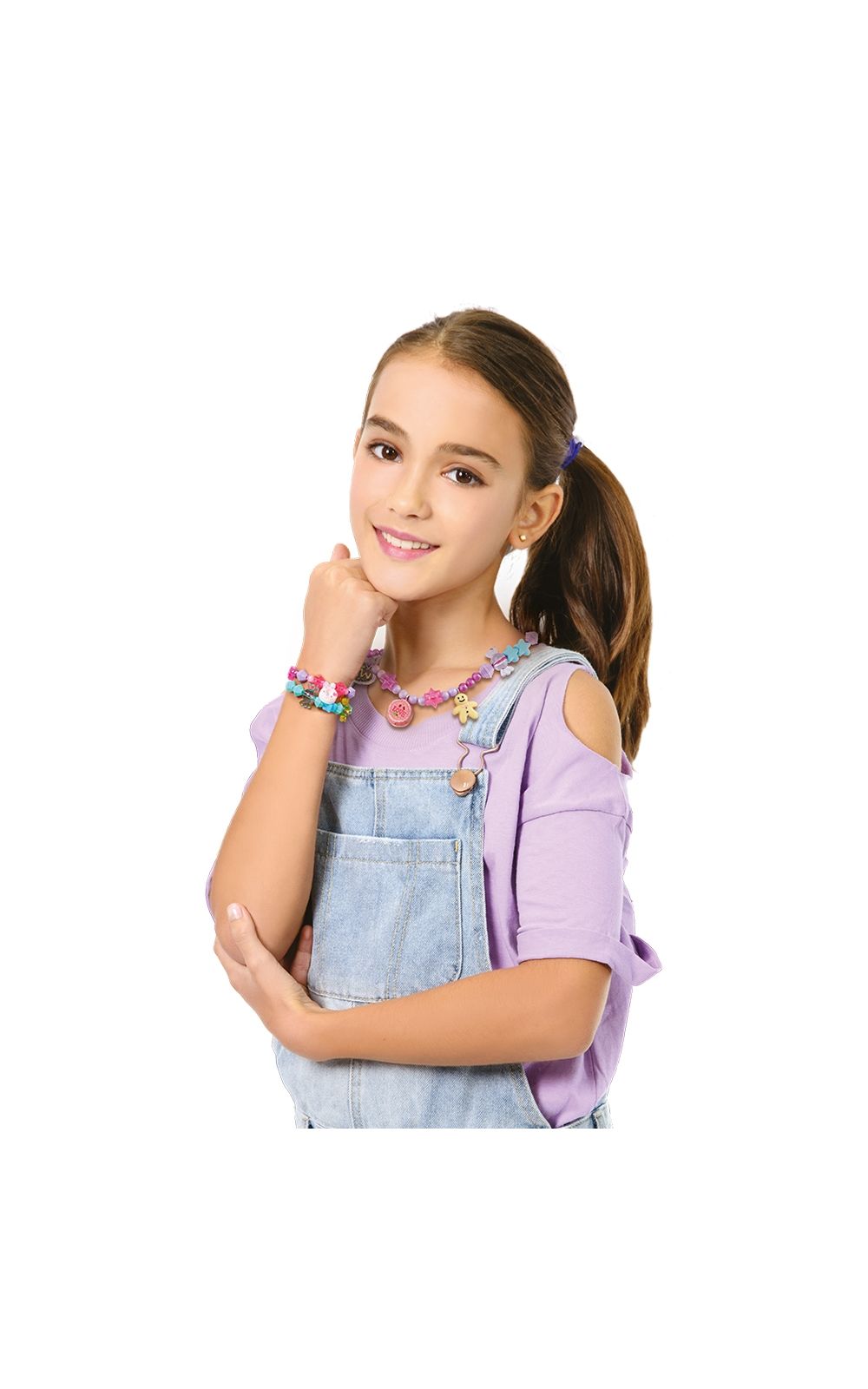 Faça seu próprio kit de pulseiras e colares super estilosos e personalizados com mais de 160 peças coloridas e com um detalhe especial: Berloques em formatos de docinhos 3D, deixando seus acessórios ainda mais fofos!